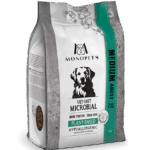 Monopets Hypoallergenic Medium Vet-Diet Microbial Plant-based: Microbieel eiwit als unieke eiwitbron, om intoleranties te helpen verminderen, en tevens een zeer duurzame eiwitbron met een lage CO2-uitstoot. Beschikbaar in zakken van 2 kg en 12 kg, voor de kleine en grote eter.