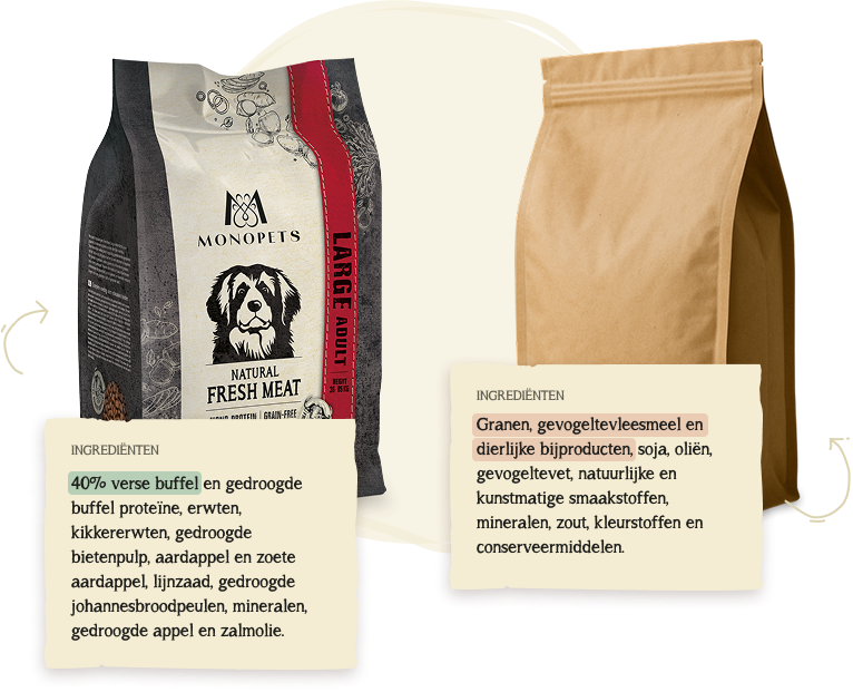 Zo ontstond Monopets: uit liefde voor honden en vanuit de overtuiging dat goed voer helder moet zijn. Elk receptuur bevat één dierlijke eiwitbron, is volledig graanvrij en bevat geen kunstmatige toevoegingen. Zo weet je precies wat je hond eet.